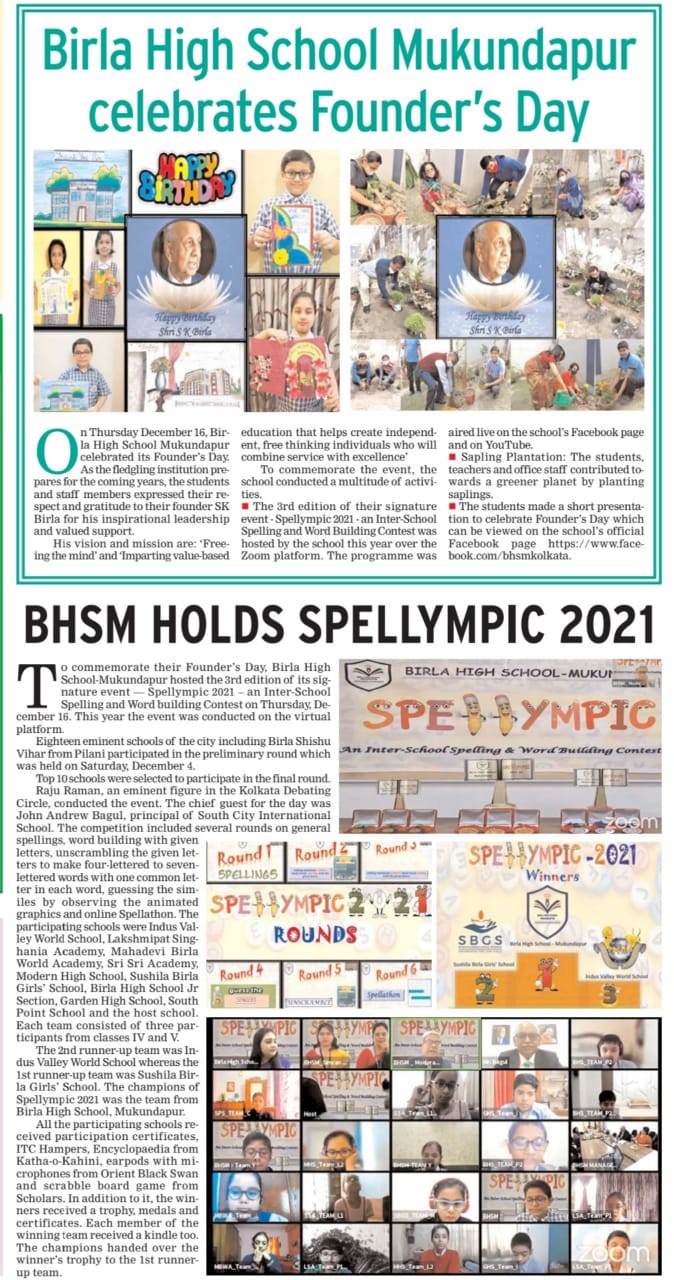 Birla High School - Mukundapur celebrates their Founder's Day and hosts their annual event SPELLYMPIC 2021