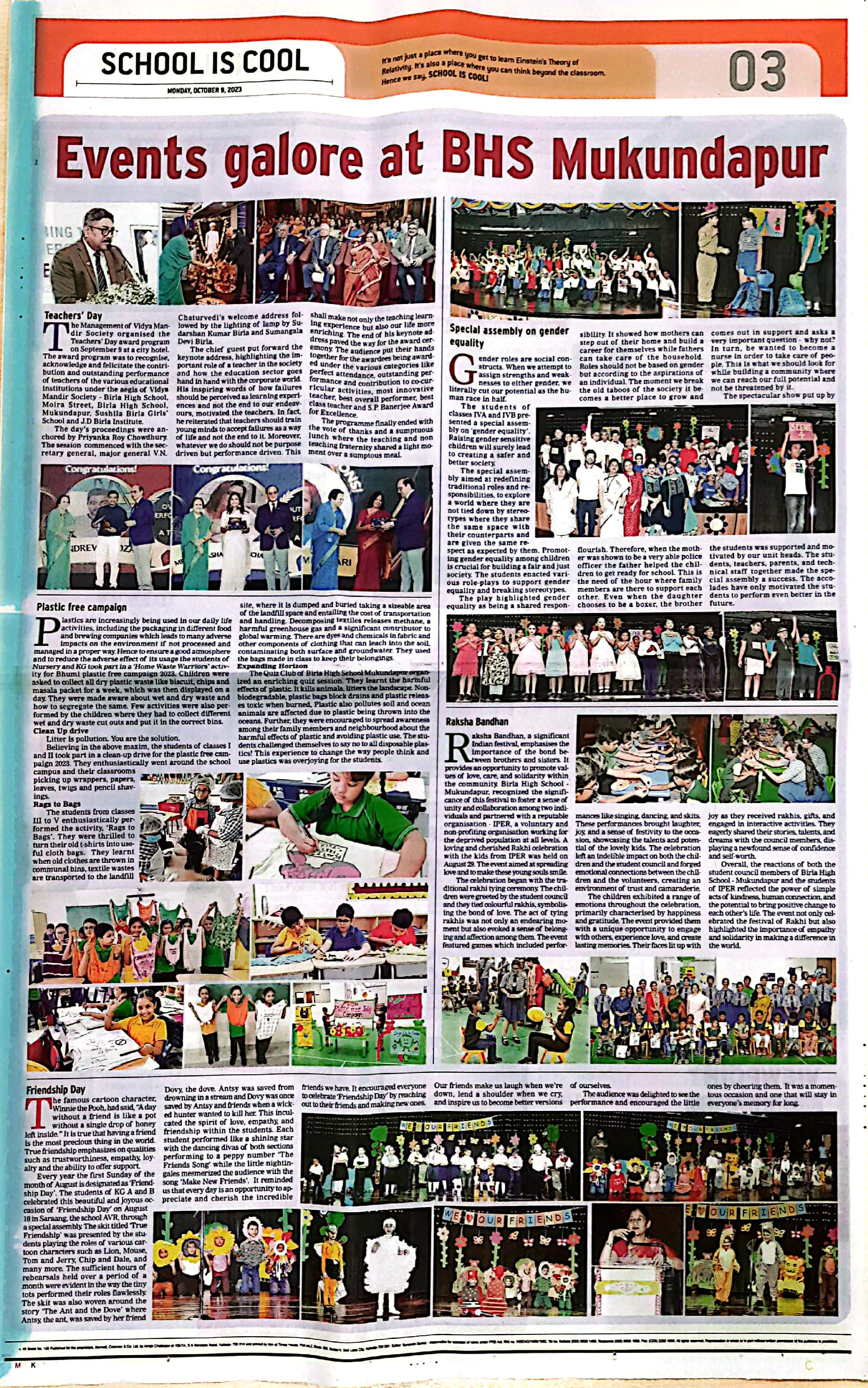 Birla High School - Mukundapur celebrates Teachers' Day, Gender Equality, Plastic Free Campaign, Raksha Bandhan, Friendship Day
